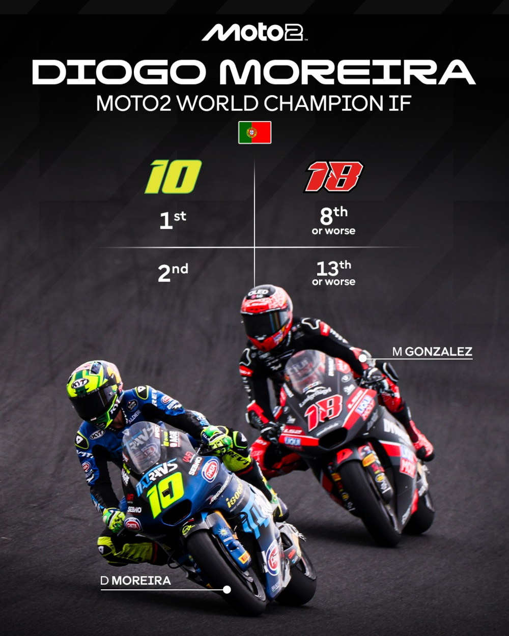 이번 포르투갈 Portimao에서는 디오고 모레이라가 곤잘레즈를 상대로 Moto2 월드 챔피언 타이틀을 획득할 첫 기회를 맞이합니다.