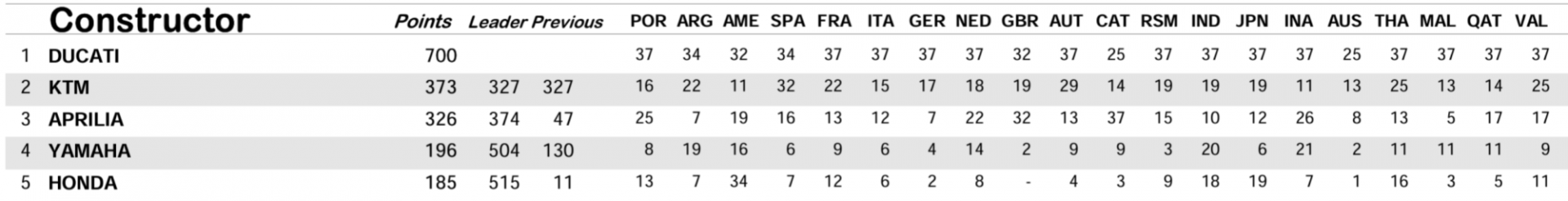 컨스트럭터 챔피언십 포인트는 그랑프리에서 제조업체 라이더 중 가장 높은 순위를 차지한 라이더의 포인트가 합산되는 것입니다.