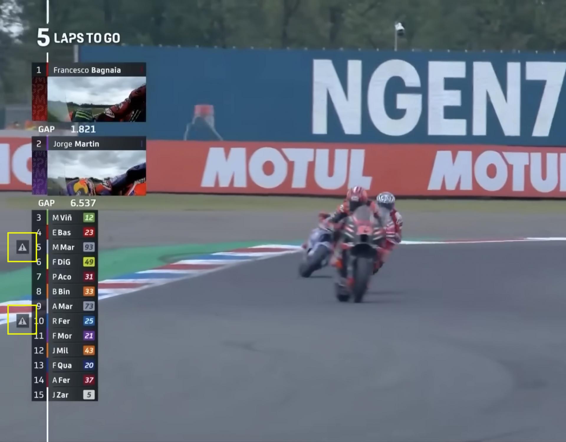 또한 Misano 그랑프리에서 파비오 쿼타라로 Fabio QUARTARARO가 롱 랩 페널티를 부과 받았지만 페널티를 수행하지 않고 체커기를 받았고 레이스 디렉터는 3초 페널티를 부과하여 폴 에스파가로에 3위를 내준 적이 있습니다.