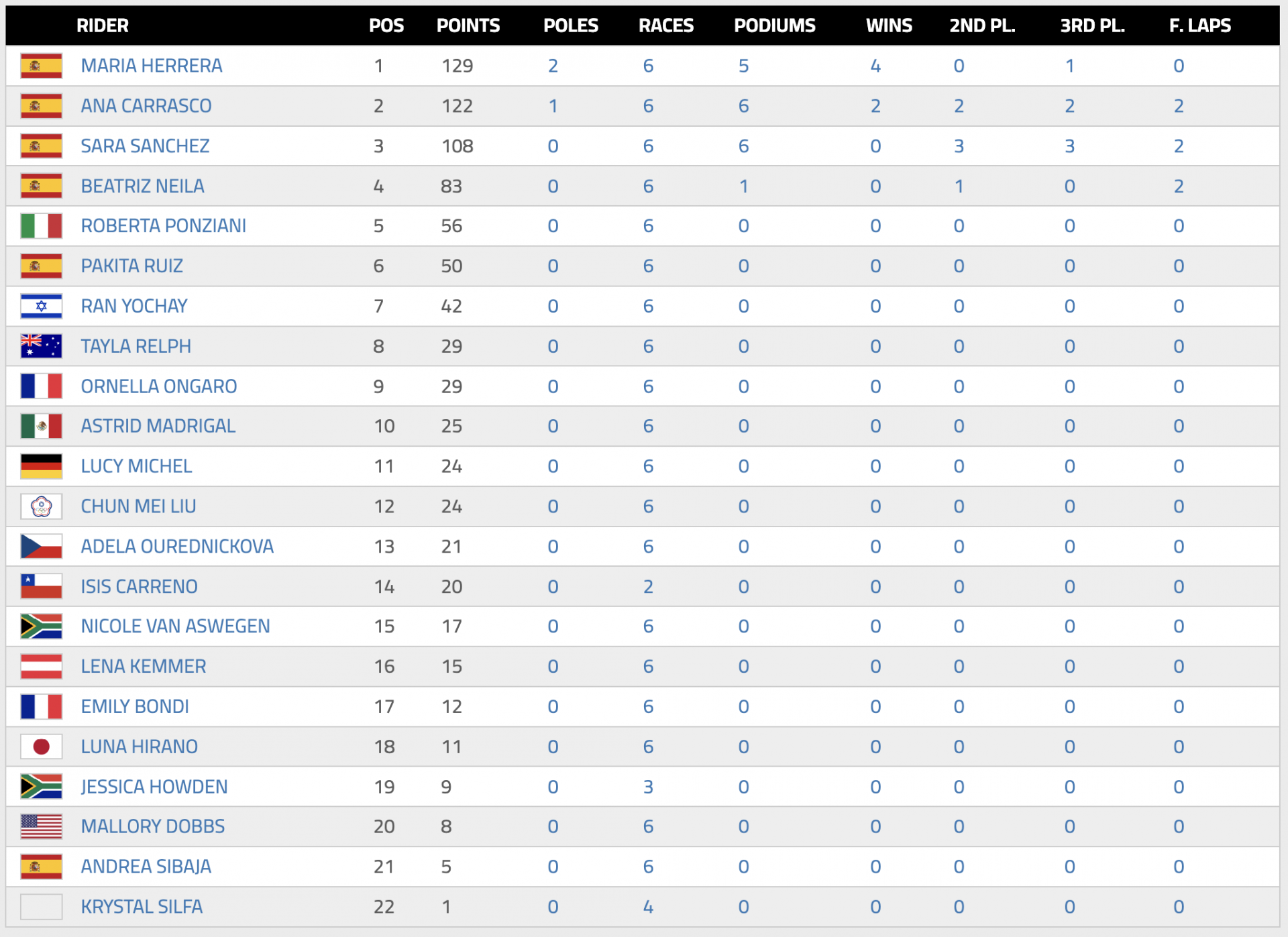 챔피언십 리더는 마리아 에레라로 4승으로 129점을 획득하고 있고 카라스코는 우승은 2승으로 에레라보다 적지만 전 경기 포디엄에 오르며 122점으로 불과 7점 차이로 2위에 랭크되어 있습니다.